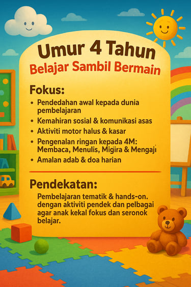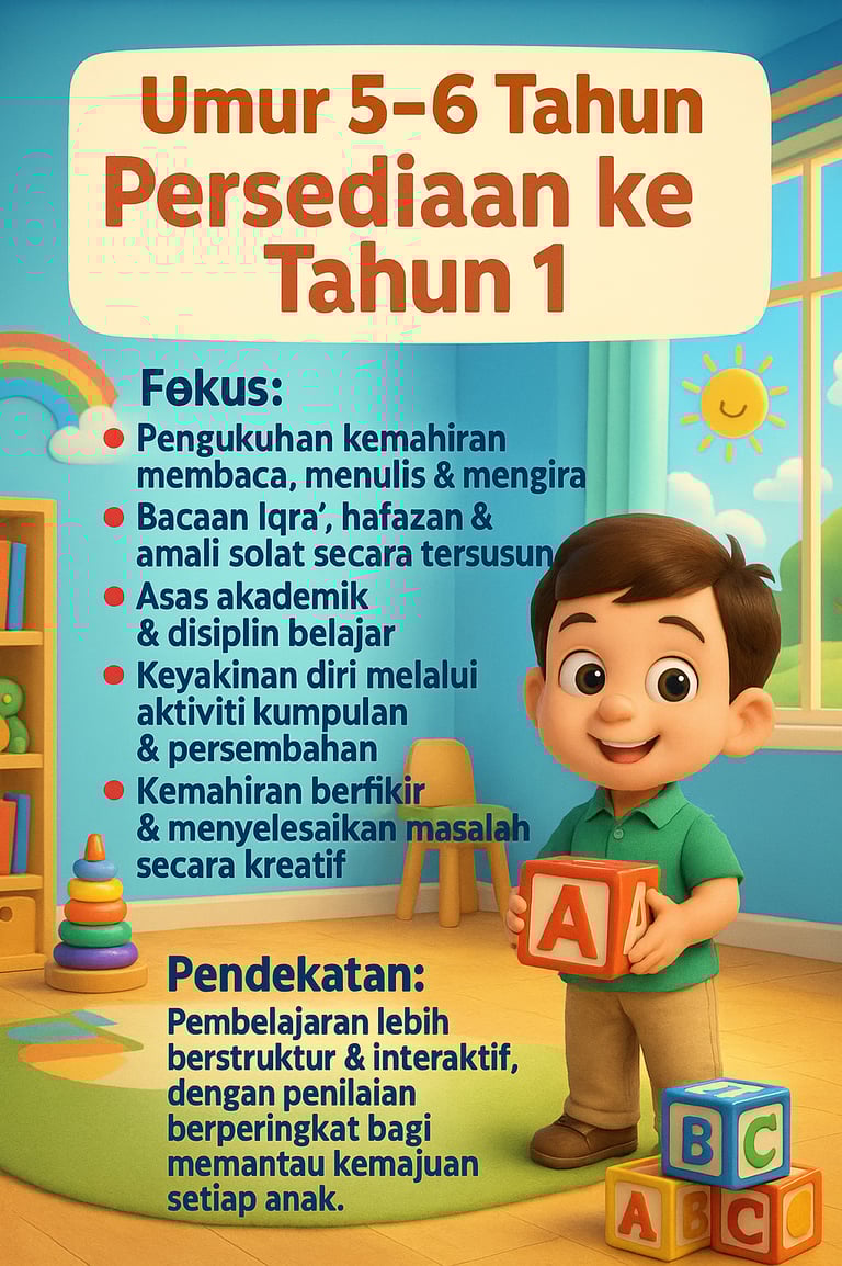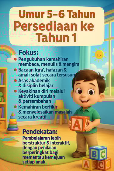 Disusun mengikut peringkat umur dan perkembangan semula jadi anak, supaya setiap anak belajar dengan seronok, aktif dan bermakna.